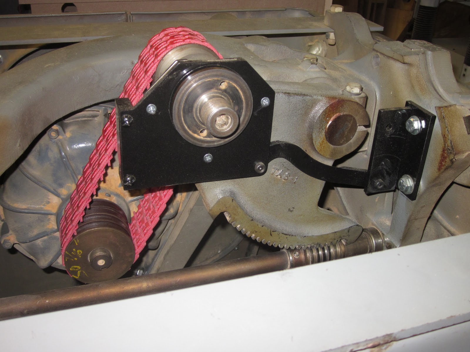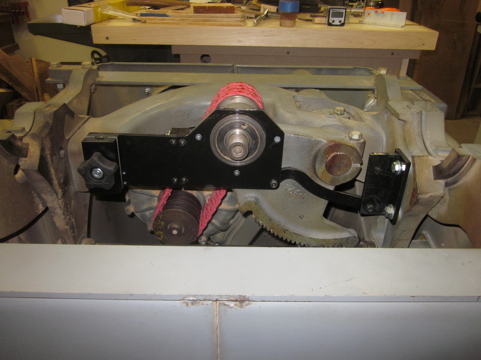 And the next part was probable the hardest part of the entire installation. Putting on the belts. I used a car jack to lift the motor after the retaining bolts were loosened. When installing the belts and lowering the motor I found that the motor had to be perfectly level to the arbor or 1 of the 4 belts would be slack. I had always intended to put the original belts back on, since I remembered them being in good shape when I took them off. But after looking at them when the time came, they were in pretty rough shape. So after calling every place nearby that carries belts, I found that no one had 4 in stock. Actually no one had more than 1 in stock. So I drove to Woodcraft and picked up some link belt. I like link belts since they do a great job of eliminating vibration and they are always the correct size. but they are overkill on this saw since it never vibrated anyway. but here's the arbor in place with the belts on.